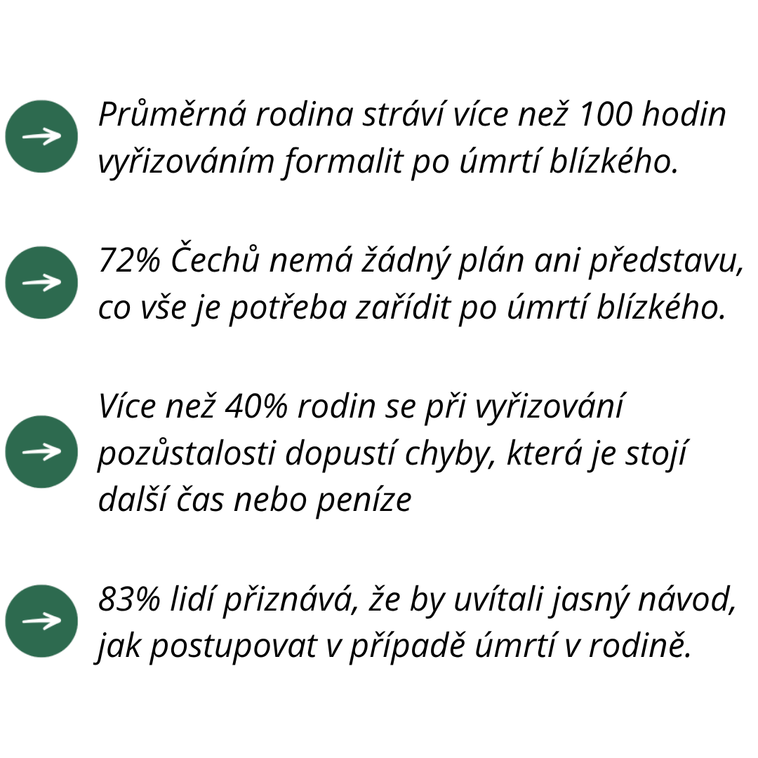 Každý rok v České republice zemře přes 110 000 lidí. Za každým z životních příběhů stojí průměrně 4-6 blízkých osob, které se musí vypořádat nejen s emocionální ztrátou, ale také s desítkami administrativních úkonů, návštěv úřadů a kritických rozhodnutí.